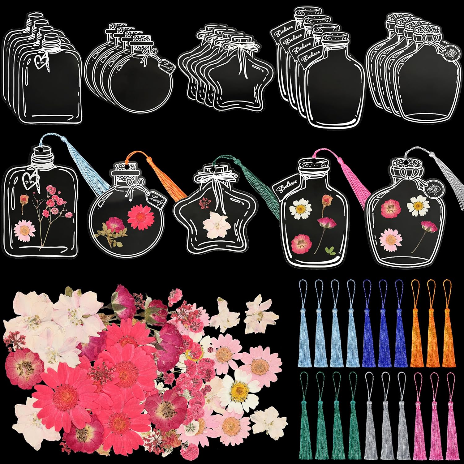 Joyclub Dried Flower Bookmark Kit 20PCS Easy DIY Transparent Bookmarks Kits with Colorful Tassels Tweezer Scraper Open Adhesive Tape for Book Bottle Supplies