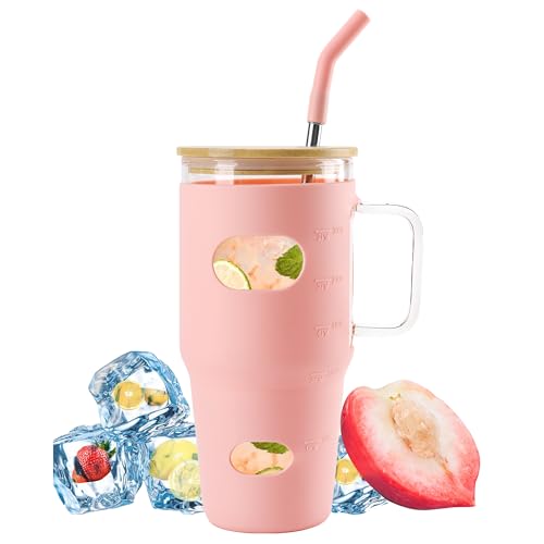 Joyclub 32 oz Glass Tumbler with Lid and Straw, Glass Water Bottles with Handle Reusable Glass Coffee Cup with Time Marker and Silicone Sleeve Fits in Cup Holder Office (Pink)