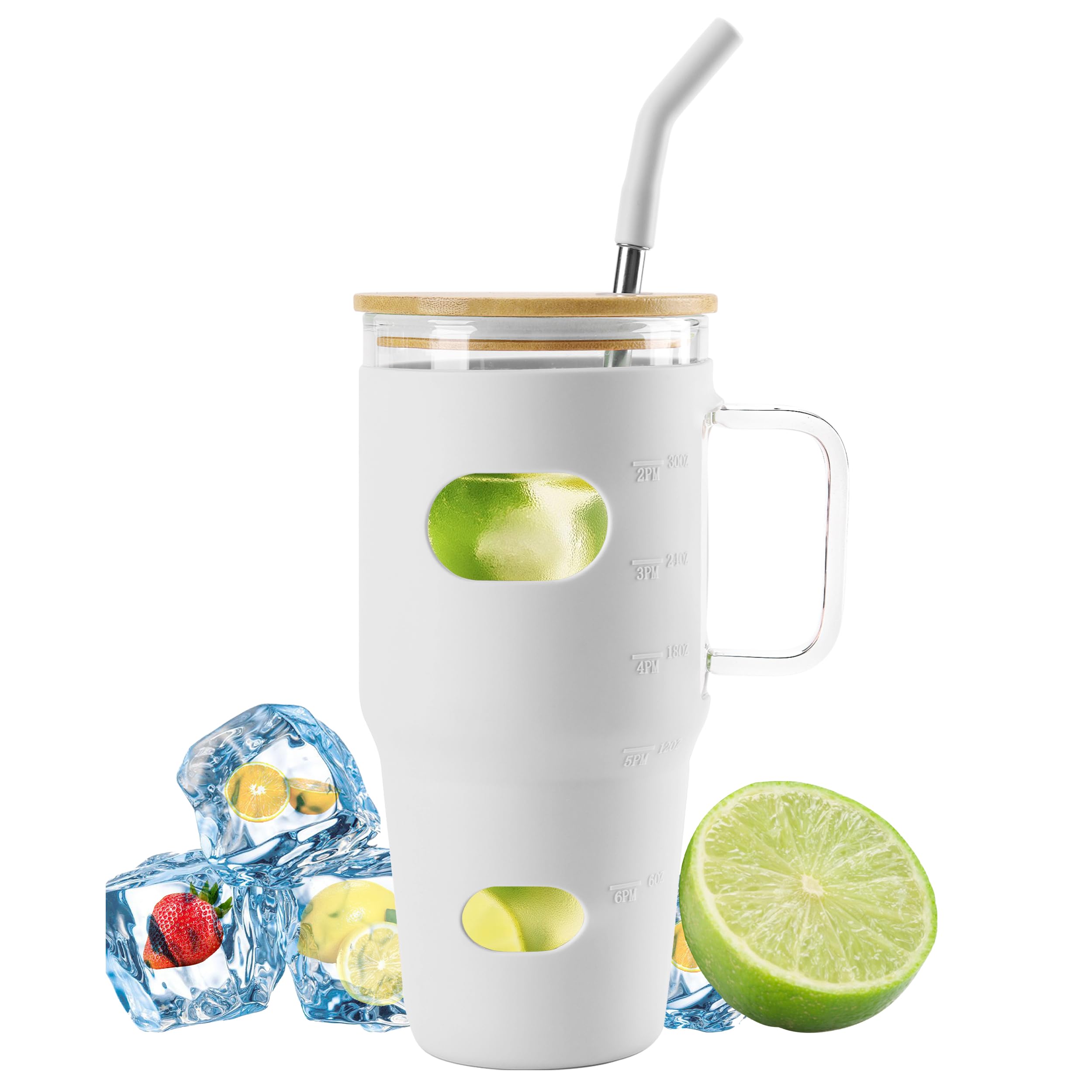 Joyclub 32 oz Glass Tumbler with Lid and Straw, Glass Water Bottles with Handle Reusable Glass Coffee Cup with Time Marker and Silicone Sleeve Fits in Cup Holder Office (White)