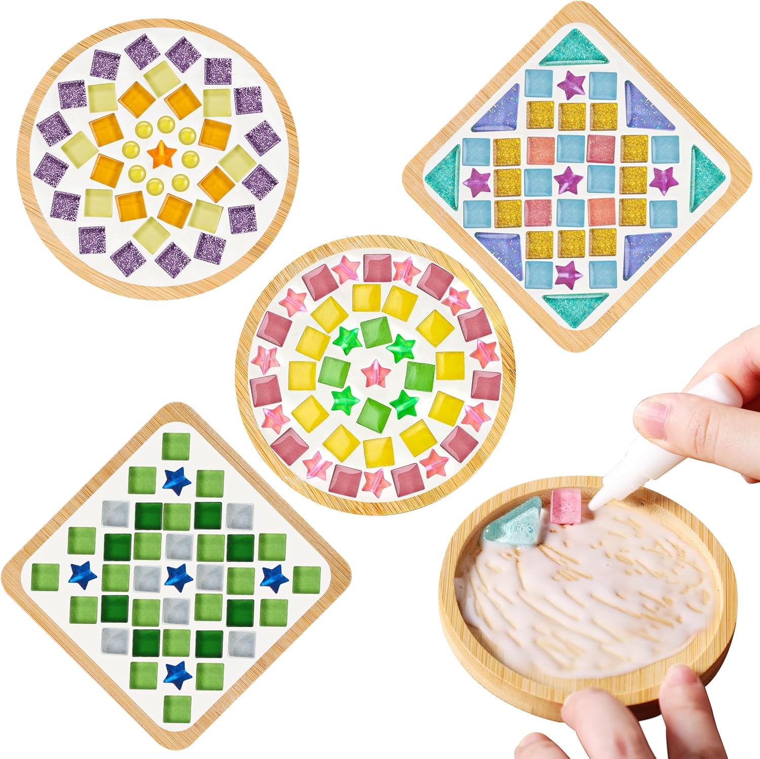 4 Sets DIY Glass Mosaic Tile Kits with Wooden Coasters
